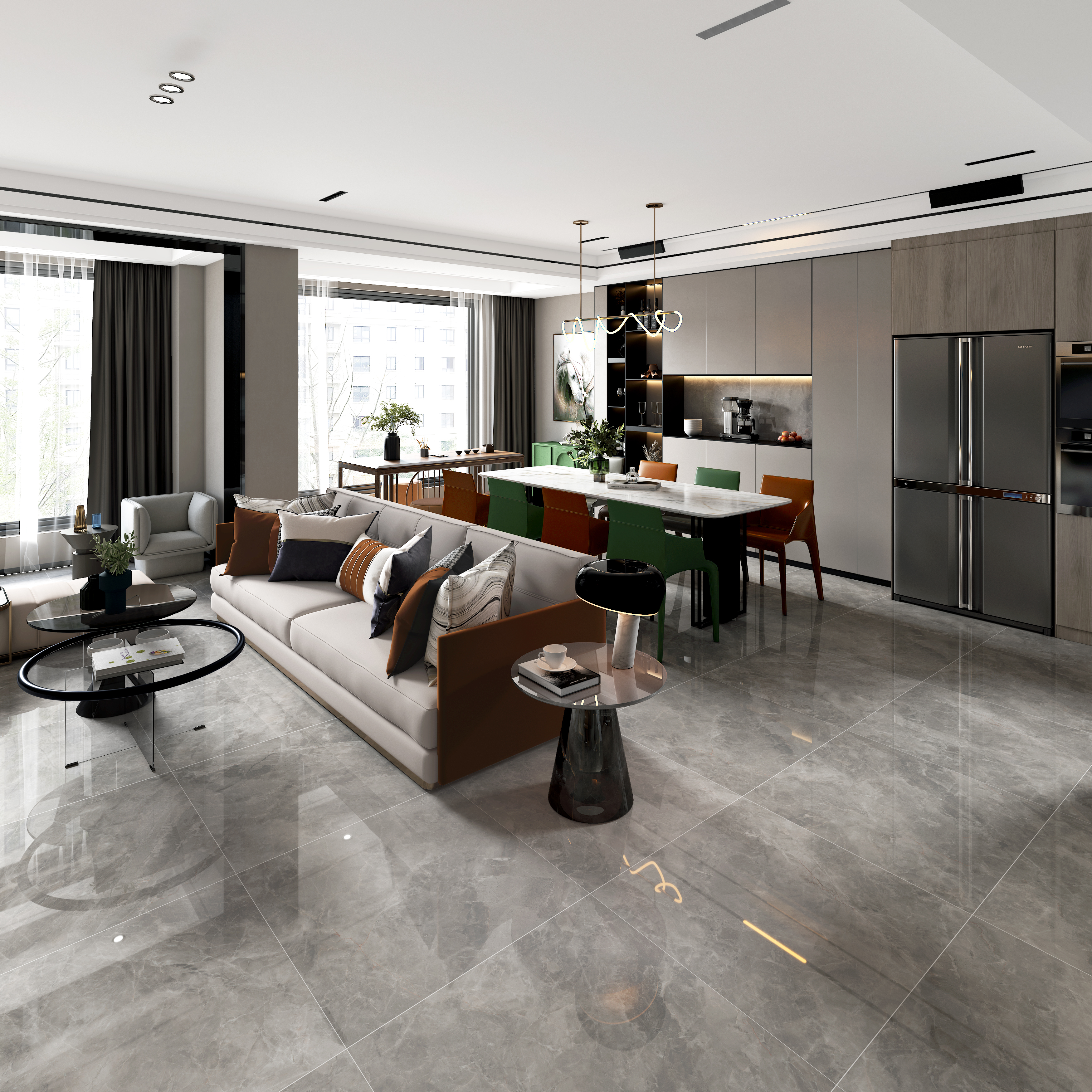 淡灰色的紋路又讓整個空間彌漫著一種浪漫與柔情。將理性成熟與優雅浪漫這兩種原本格格不入的元素巧妙地契合在一起,給人以極致的美感。